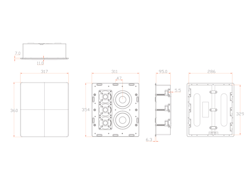 Встраиваемая двухполосная АС в закрытом корпусе. Три 1-дюймовых мягкокупольных твитера. Два 5,25-дюймовых СЧ/НЧ полипропиленовых драйвера. Диапазон частот 80 Гц - 20 кГц. Рекомендуемая мощность: 25-400Вт. Чувствительность 90дБ, 2.83V1m. Сопротивление 4 ома. Размеры (ШхВхГ): 311х354х95 мм. Размер монтажного выреза (ШхВхГ): 288х331х95 мм. Вес: 8,5 кг. Металлический прямоугольный гриль под покраску. Цвет: Белый.