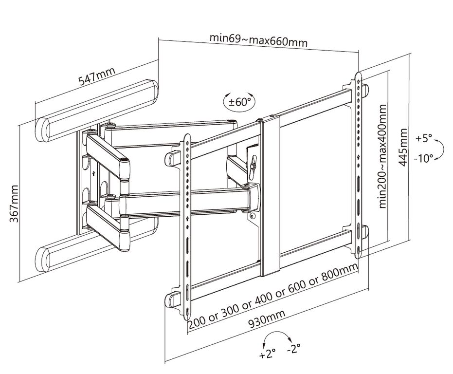 Для ТВ и панелей 49"-90", 2х2 колена, VESA 800x400мм, до 90 кг, 69-660 мм от стены, наклон -10/+5, поворот +60/-60, коррекция уровня +2/-2. Элементы выполнены из пластика, стали и алюминия.